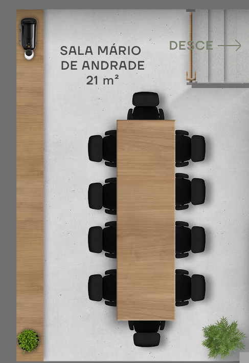 Disponibilizamos uma sala de reunião moderna e versátil, oferecendo um ambiente profissional para suas demandas empresariais. Equipada com mobiliário confortável e acesso à internet de alta velocidade, nossa sala proporciona o cenário ideal para reuniões, apresentações e entrevistas.